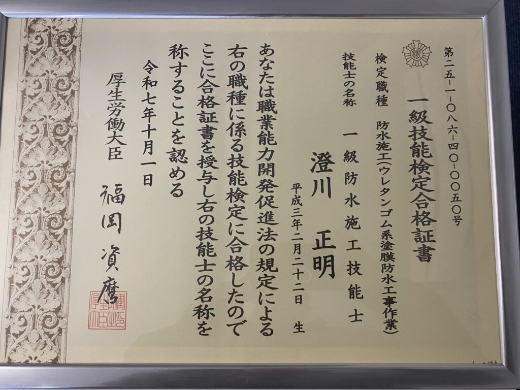 弊社の従業員が一級防水施工技能士(ウレタンゴム系塗膜防水工事作業)の試験を受けて、見事合格しました!!